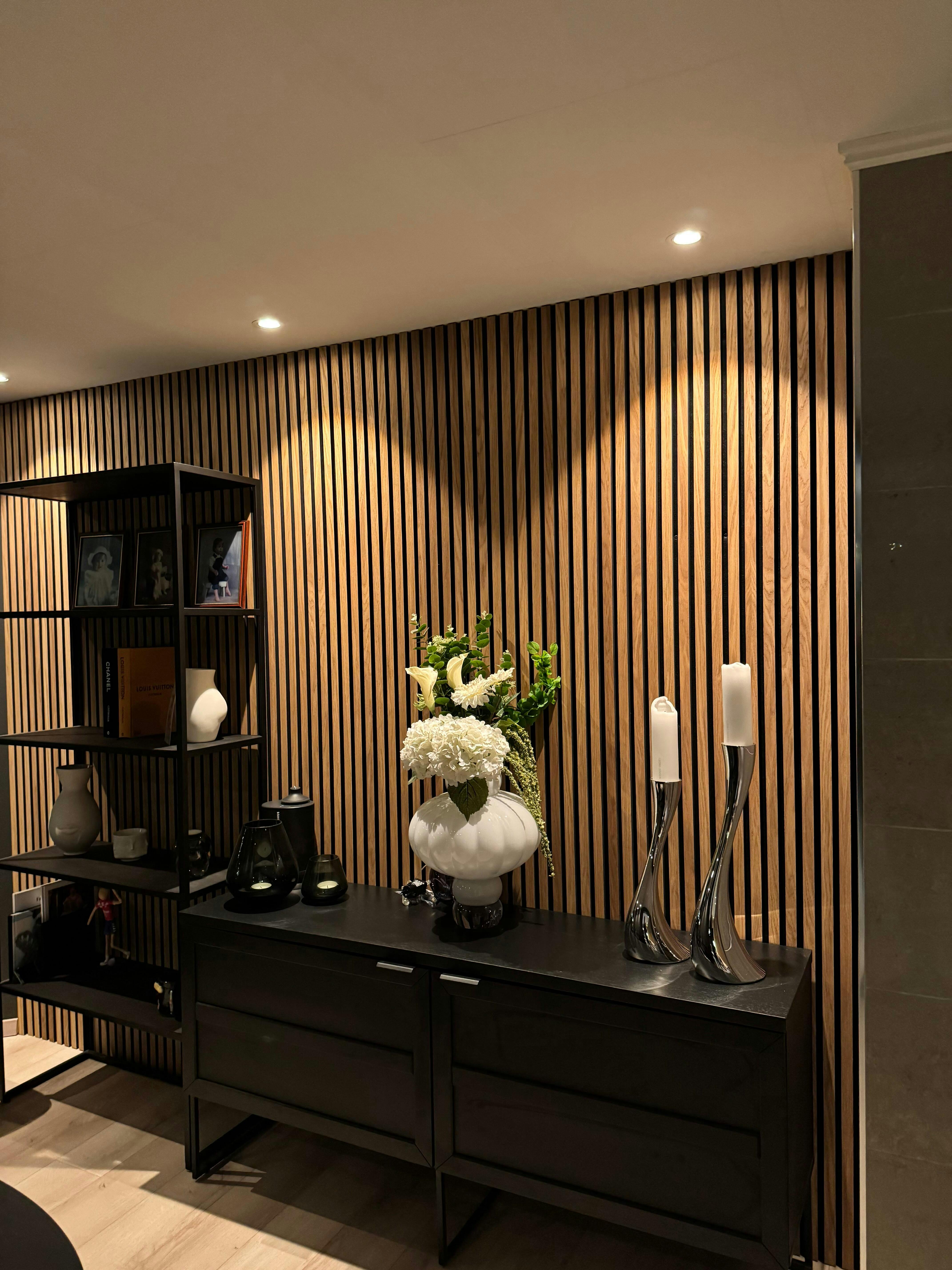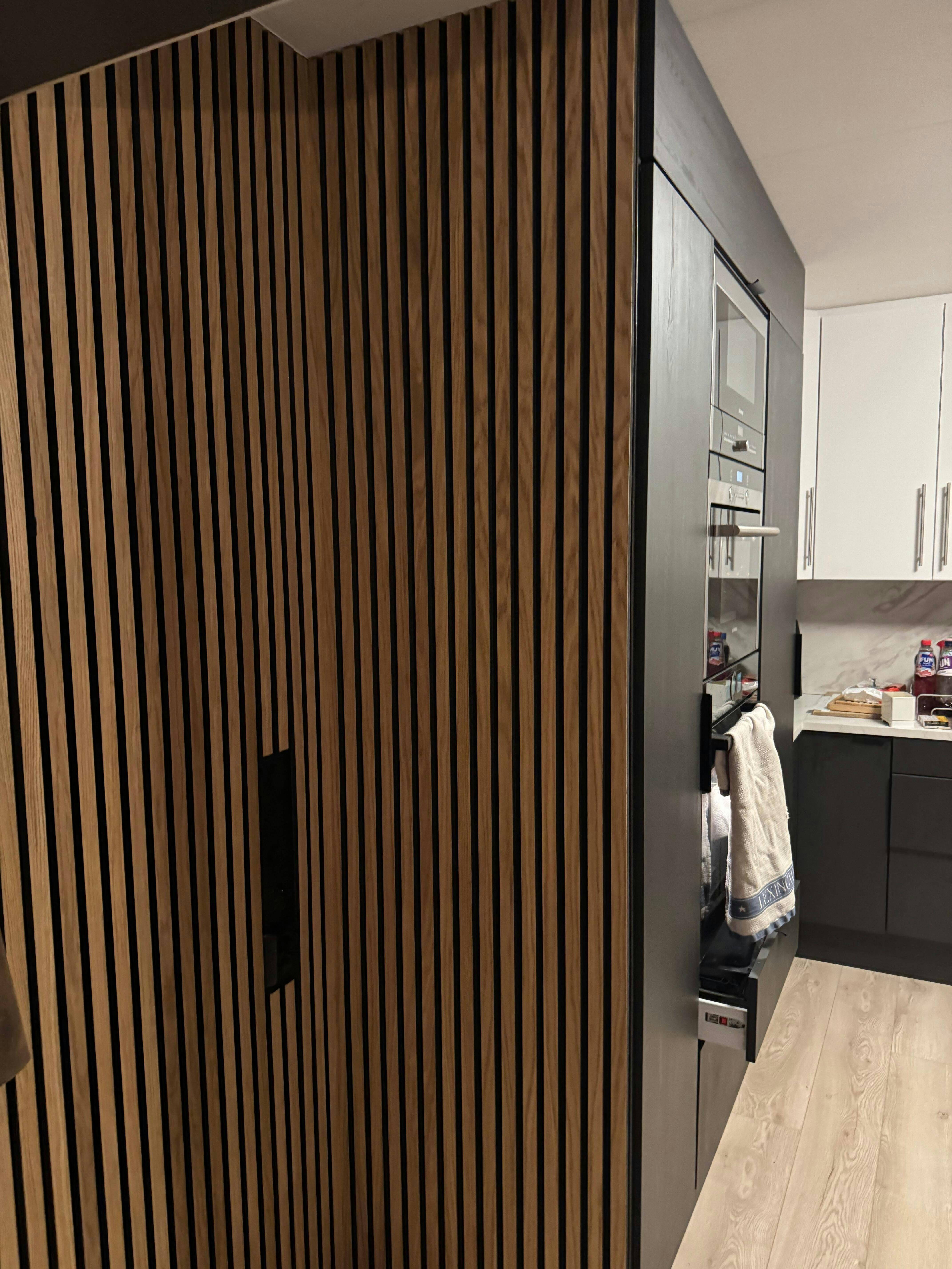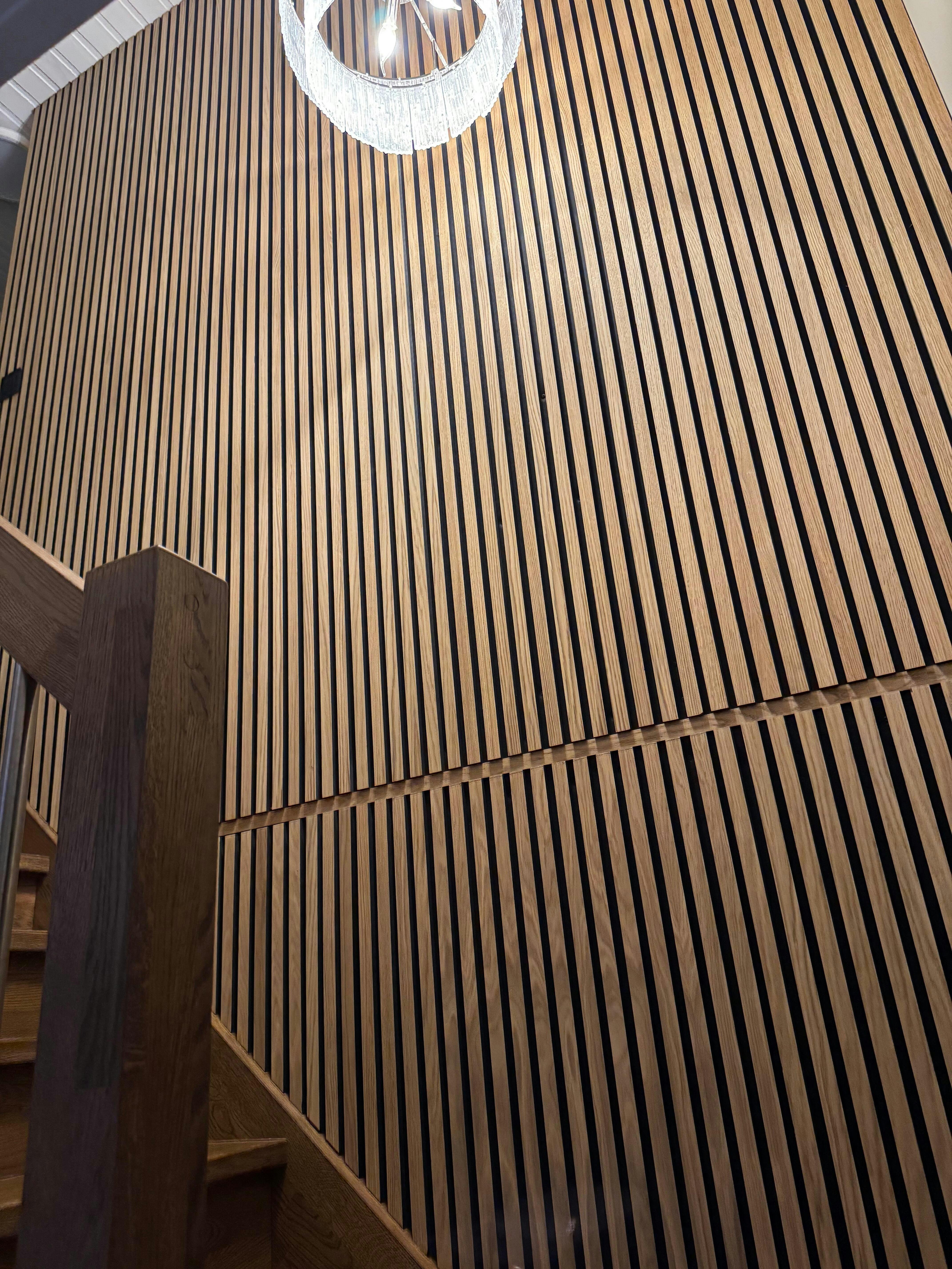 WallpanelsPRO wood slat acoustic panels enhance interior sound quality by absorbing noise and reducing echo while adding natural warmth through real timber surfaces. Their slatted structure aligns well with modern interior architecture. Panels can be ordered up to 297 cm for seamless larger installations.